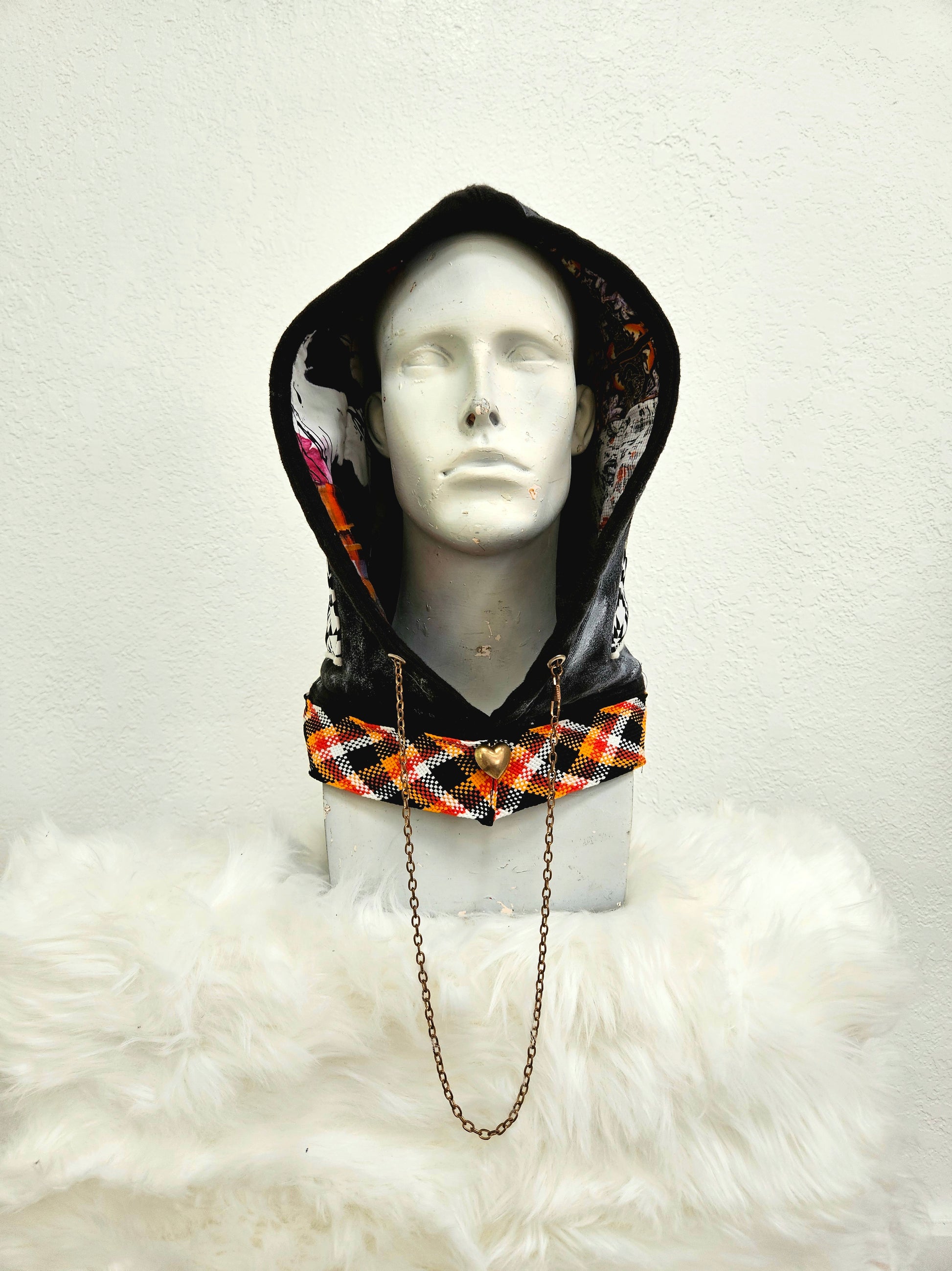 This hood was designed for our Berghain babies. Our creatures of the night. Two XL stash pockets and clashing patterns create just enough chaos to top off any little black dress.