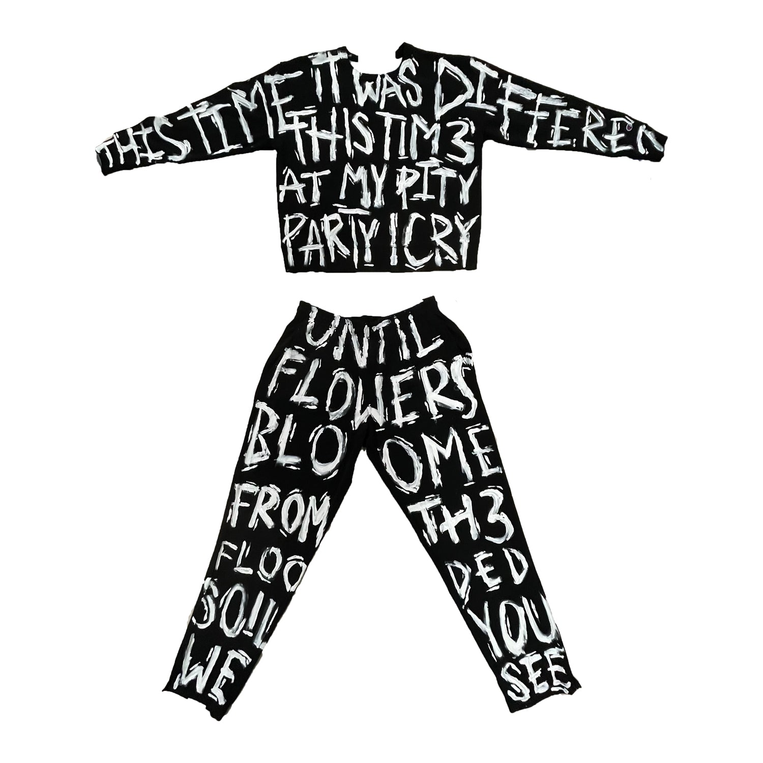 "ACID" is an original poem written by ETTE, also an original painting and now has been hand painted in white on a black Champion track suit. Style and comfort has never looked so good!